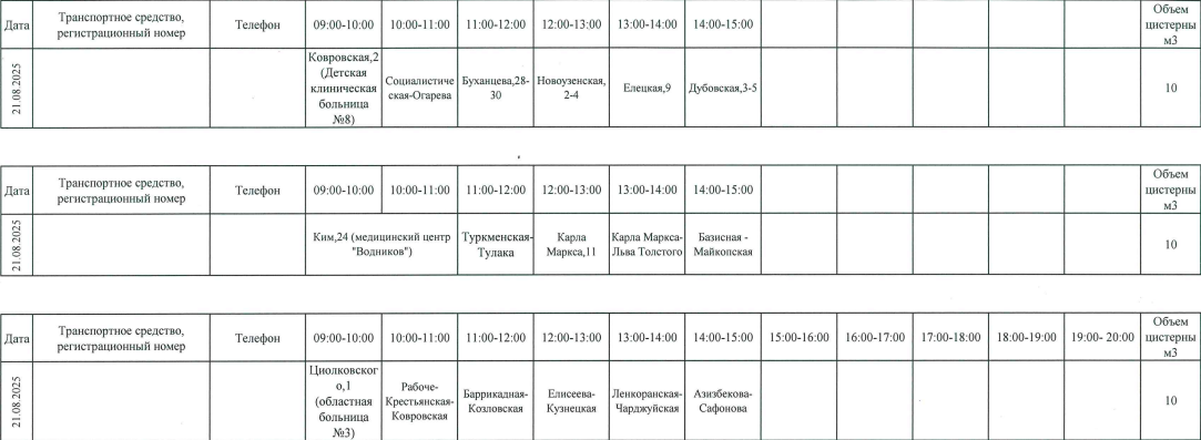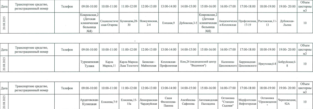 На время проведения работ ресурсоснабжающая компания организует для жителей подвоз воды по следующему графику.