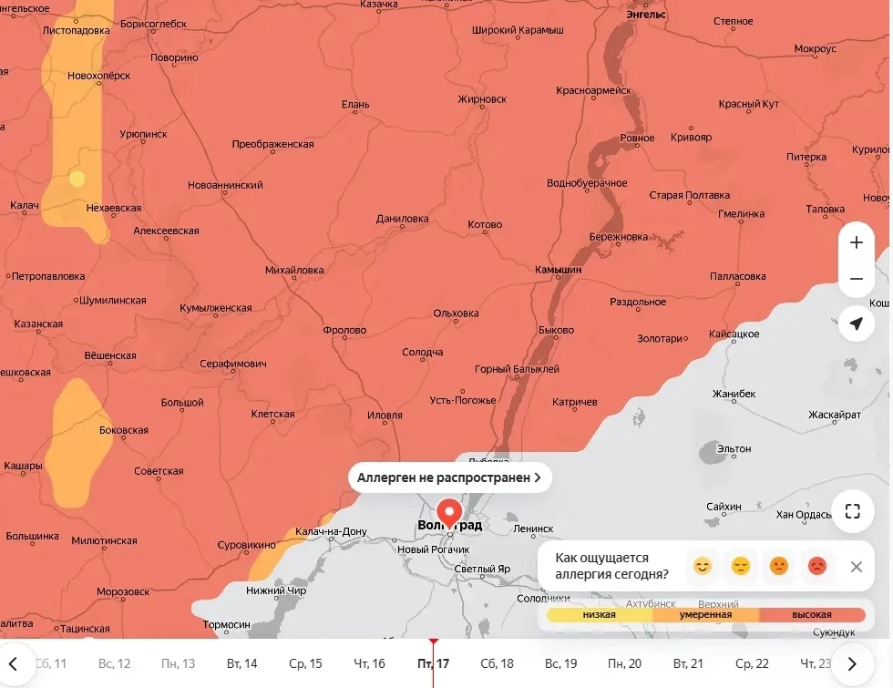 Сейчас активность высокая только в Палласовском и Николаевском районах, но к пятнице, 17 апреля, она будет такой в большинстве районах области. Волгоград, кстати, аллерген не затронет.