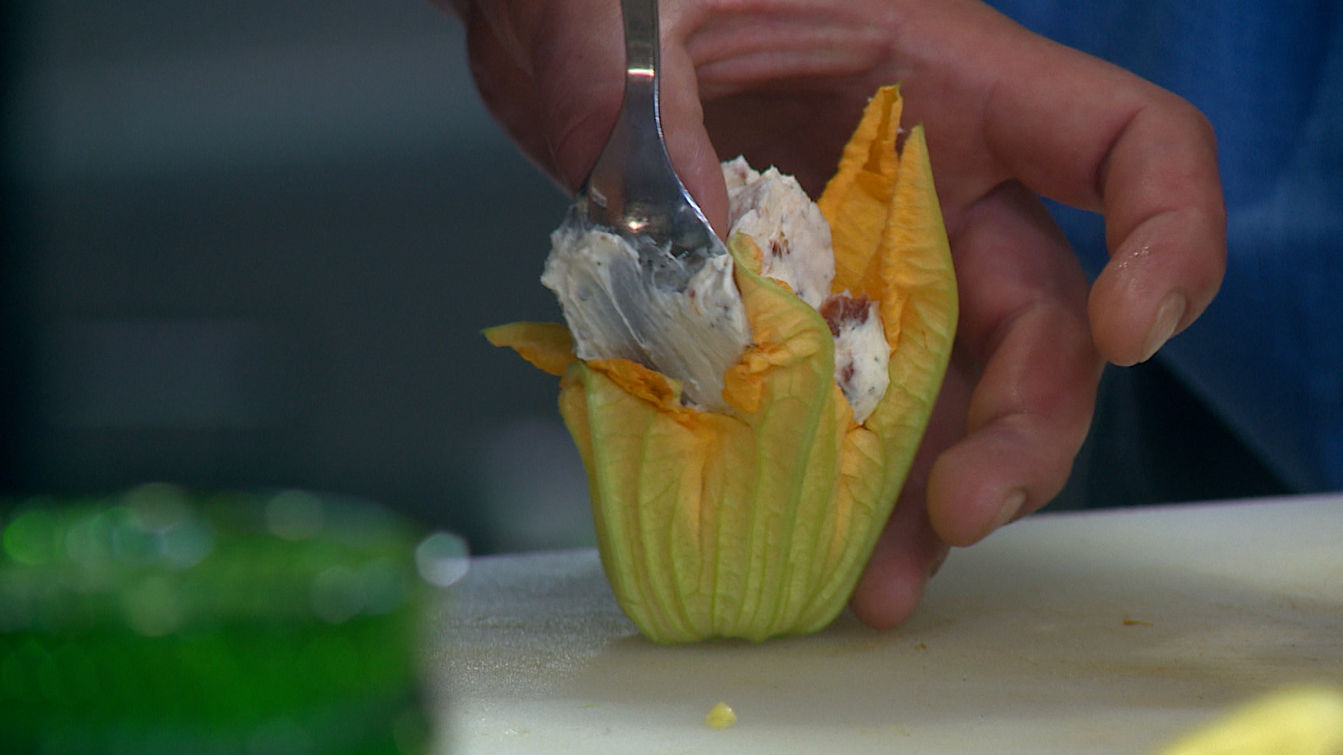 Приступаем к оформлению. Нарезаем тонкие слайсы томатов и выкладываем в круг. В центр песто и на него – фаршированный цветок. По краям украшаем кабачком и пенне из его стебля. Не забываем посолить и чуть приправить маслом. В другой подаче добавляем по краям творожный сыр со специями, чтобы почувствовать весь спектр вкусов.