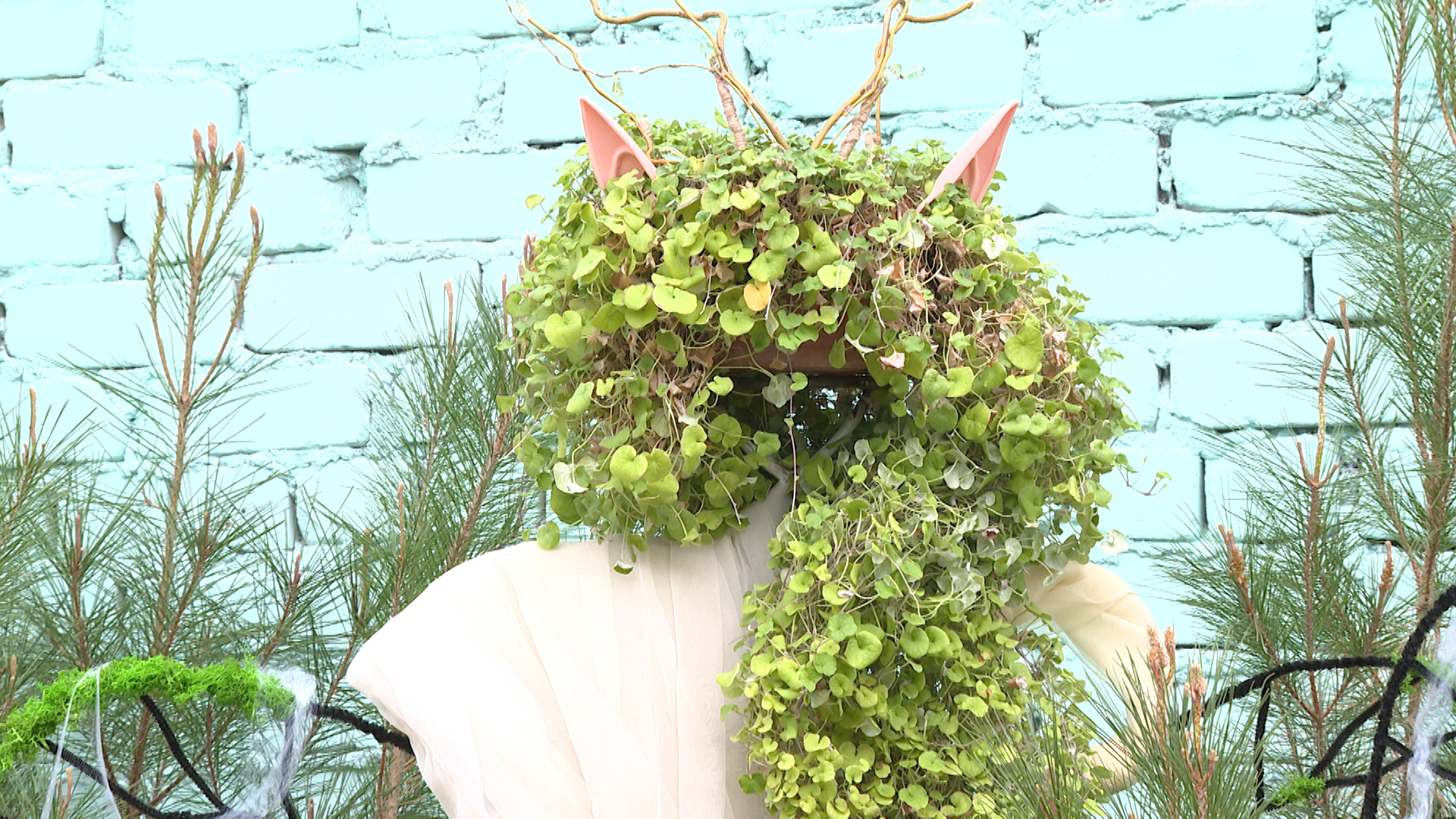 «Голова – дихондра, диадема – из живых веток, как бы сделана ива. Все естественно, все наше», – рассказывает директор Волгоградского регионального ботанического сада Евгений Власов.