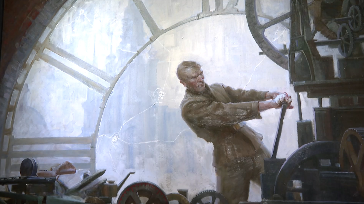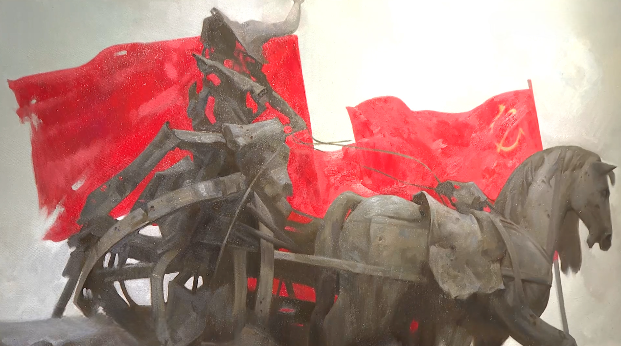 Груды искореженного металла, над которыми возвышаются советские знамена. Картина «Бранденбургские ворота», по мнению искусствоведов, словно проводит аналогию с библейским сюжетом о победе жизни над смертью. Это полотно по праву занимает центральное место в экспозиции. Рядом еще 54 картины. Художники запечатлели несколько исторических эпох.